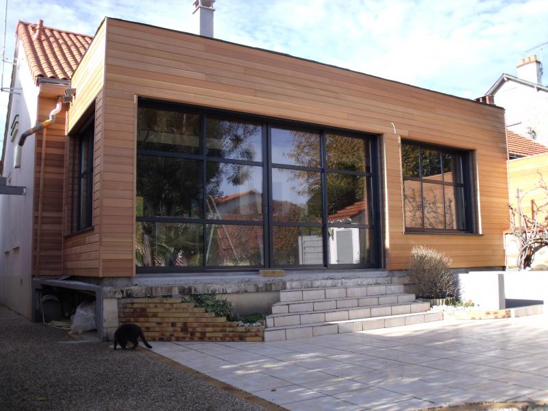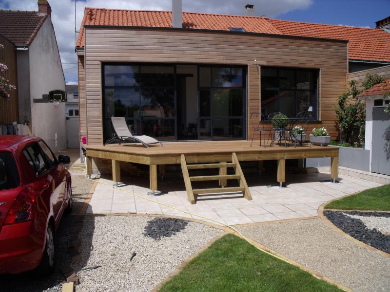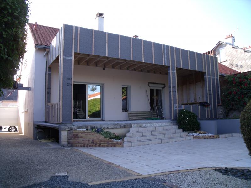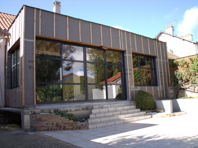 Mur ossature bois, toit terrasse avec charpente traditionnelle en bois