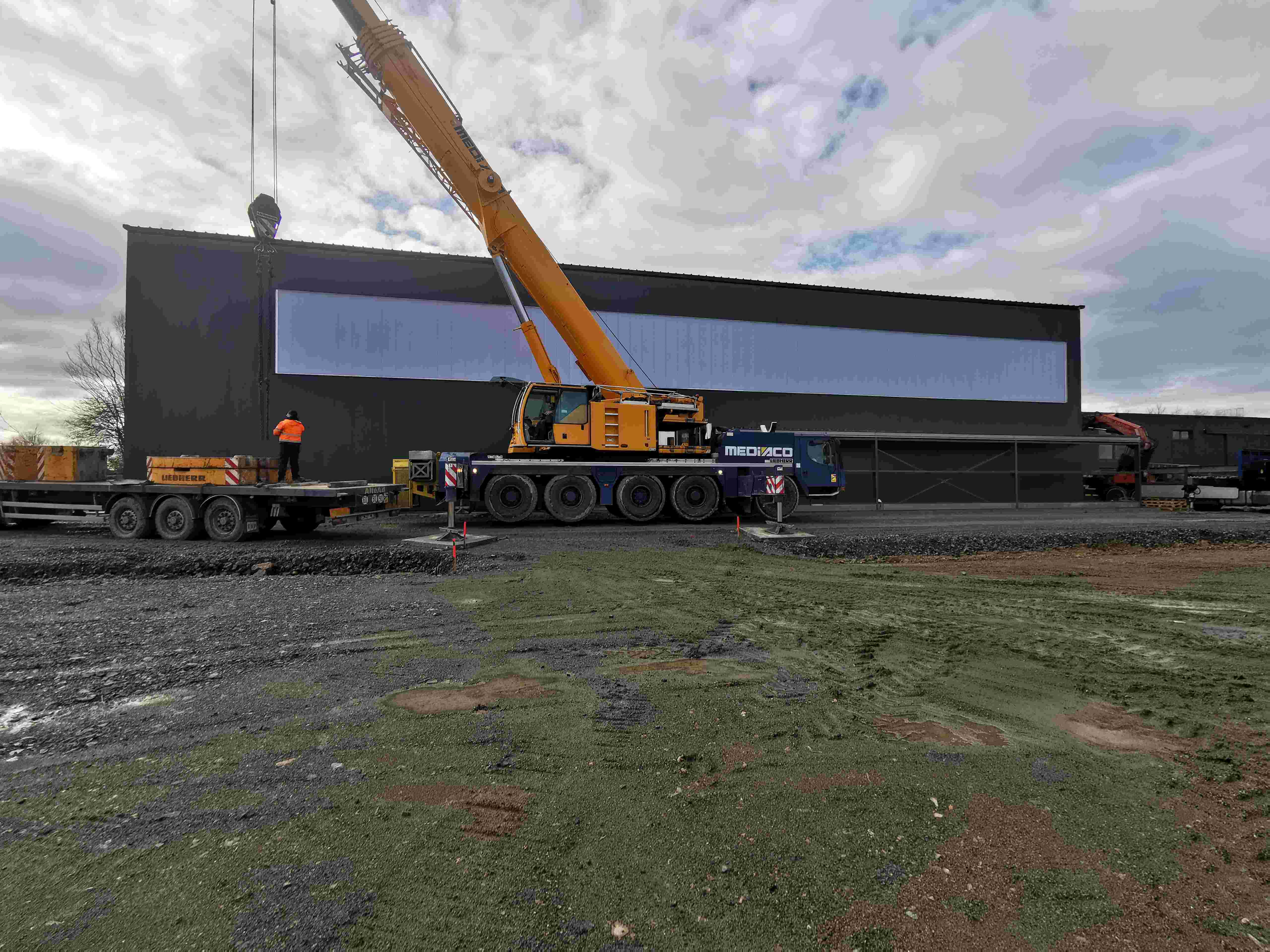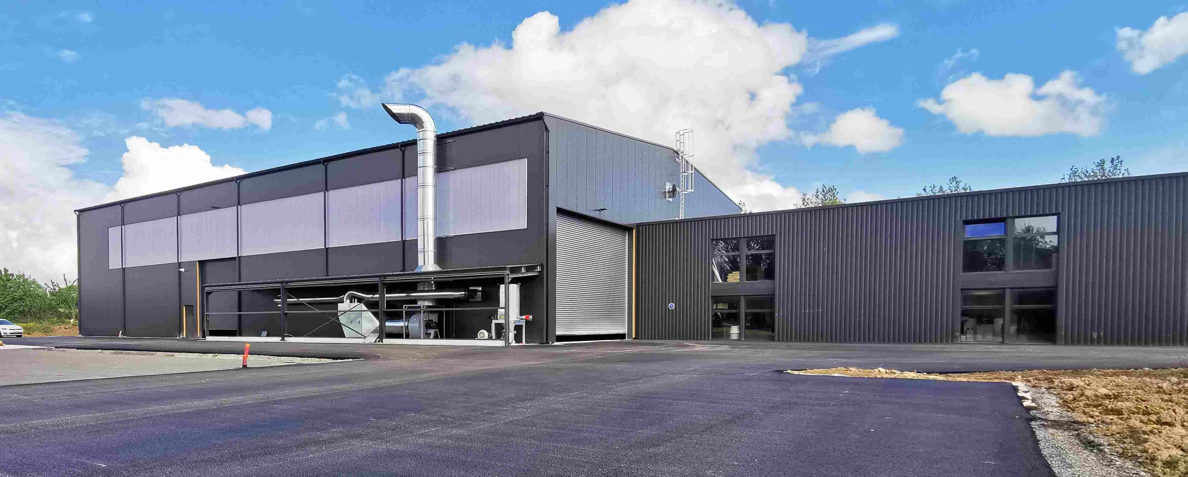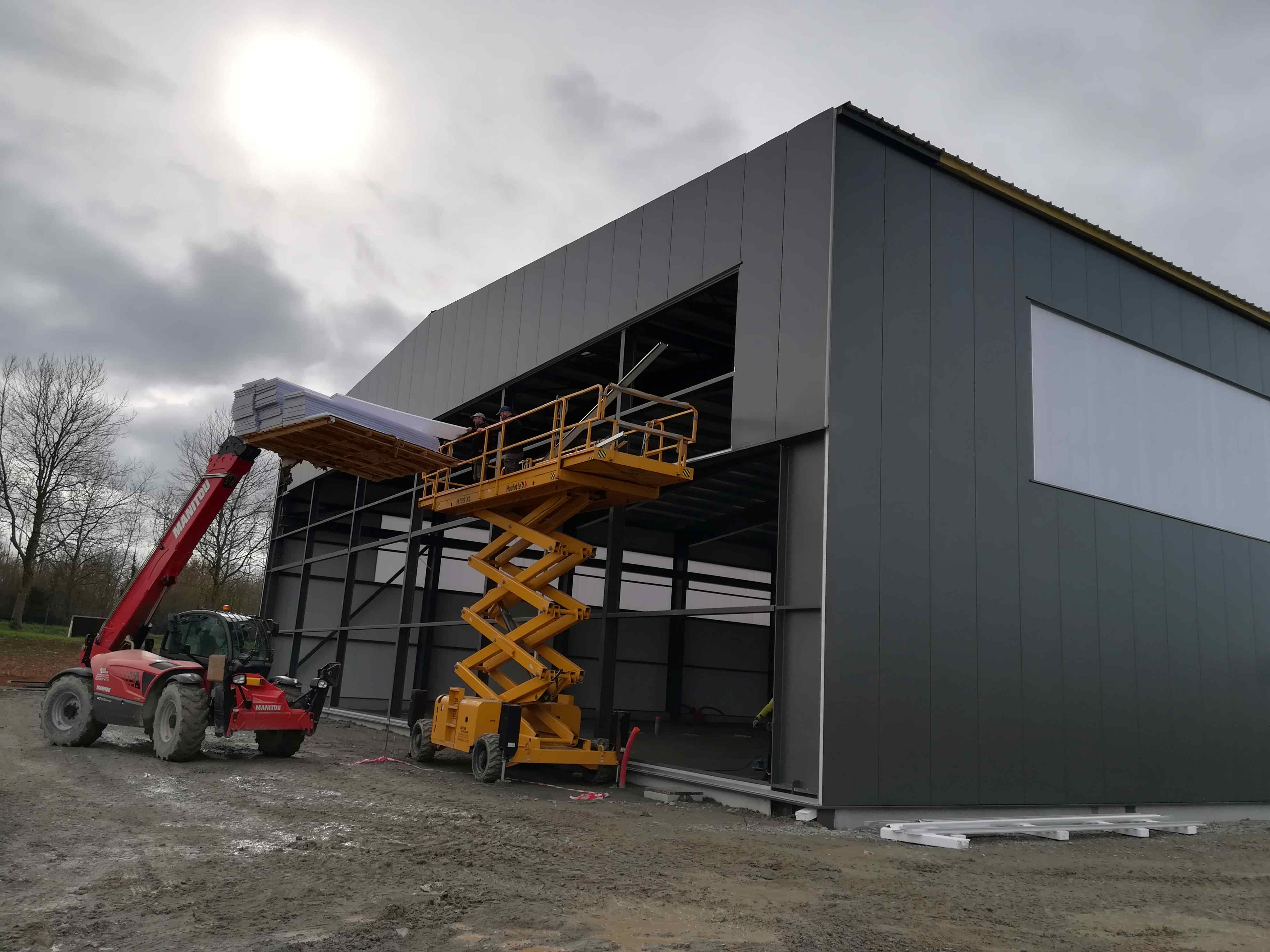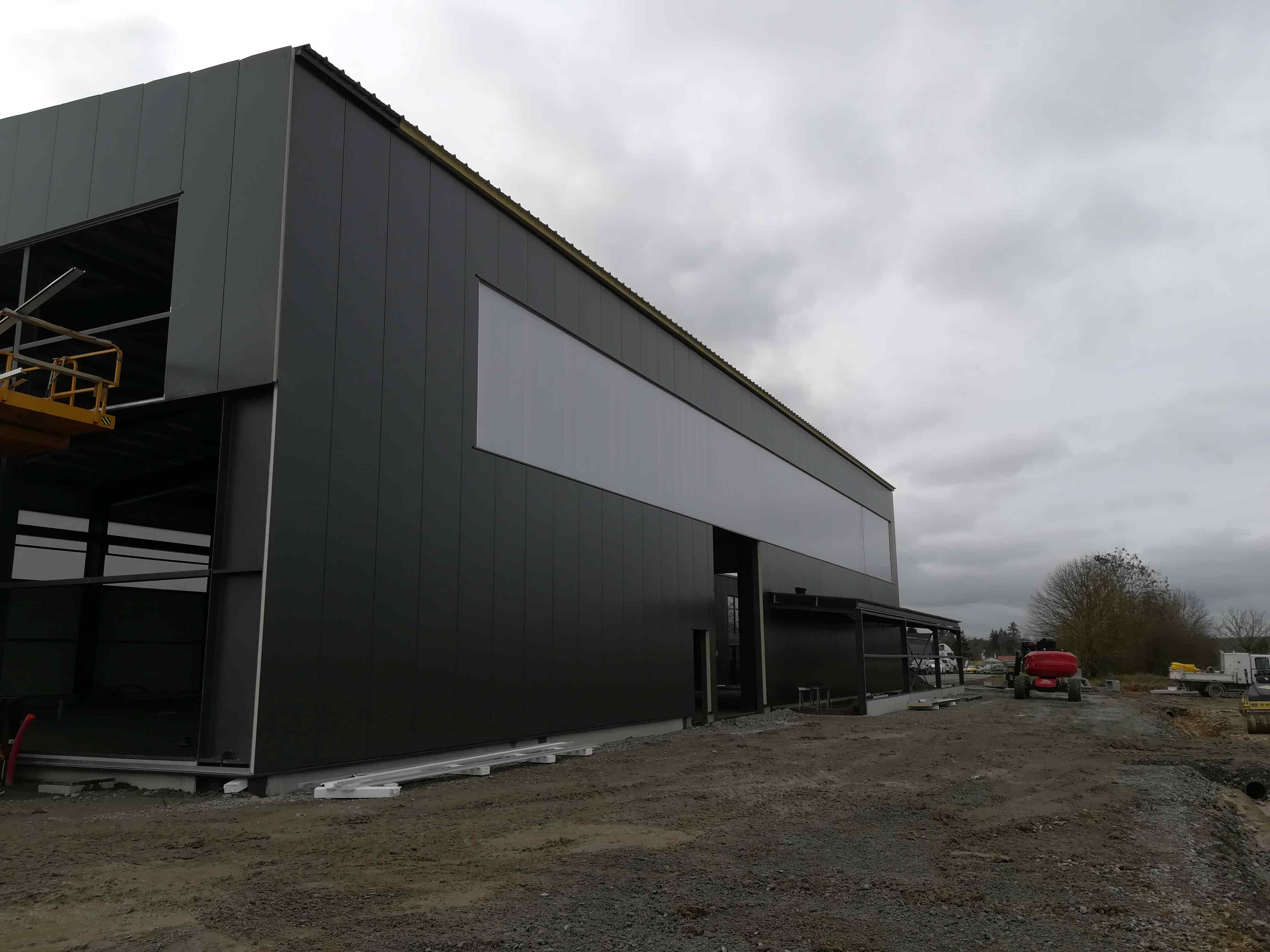 Charpente métallique avec panneaux sandwichs en couverture et bardage, bandeau lumineux, habillage en tôle acier laqué