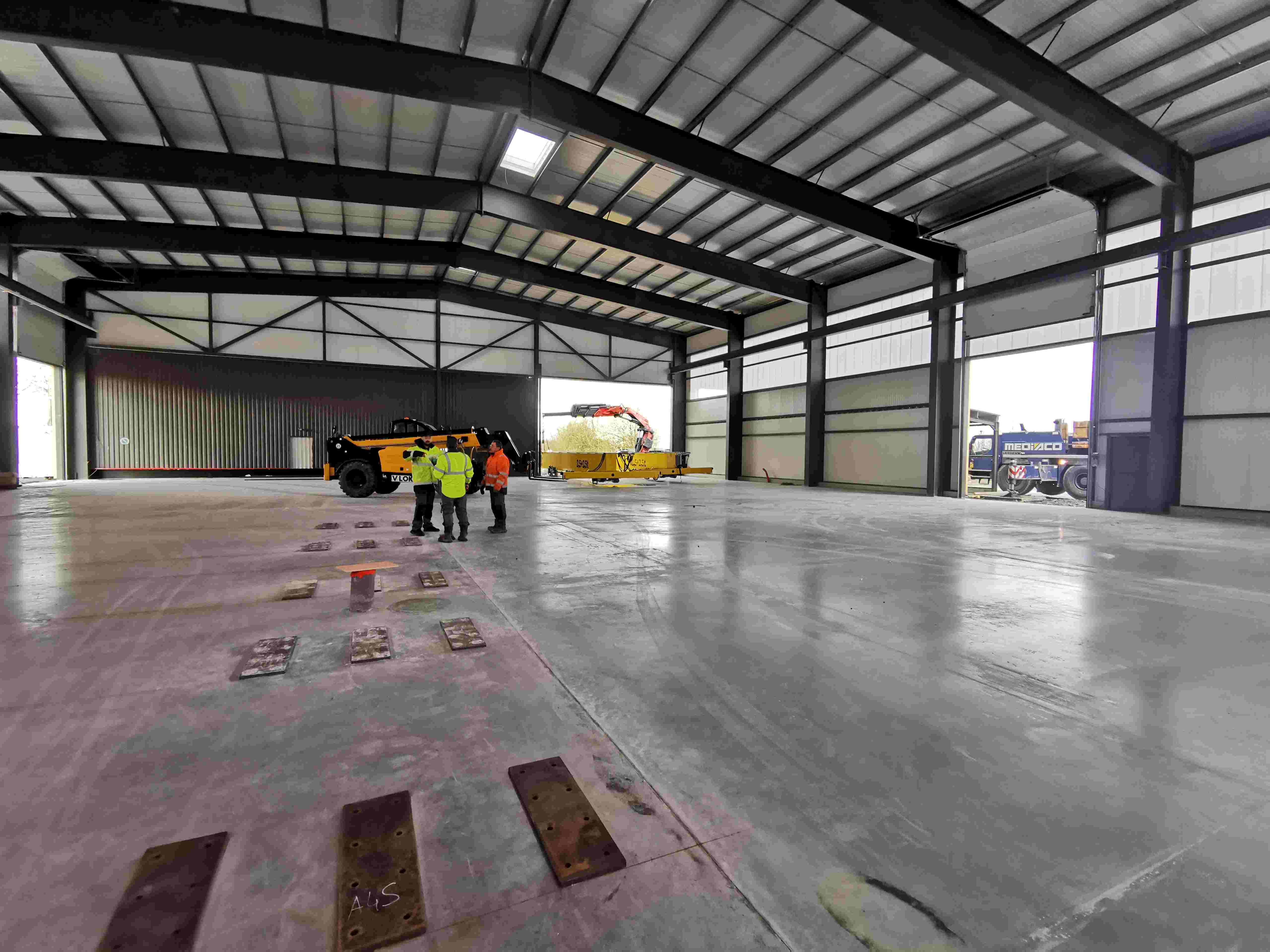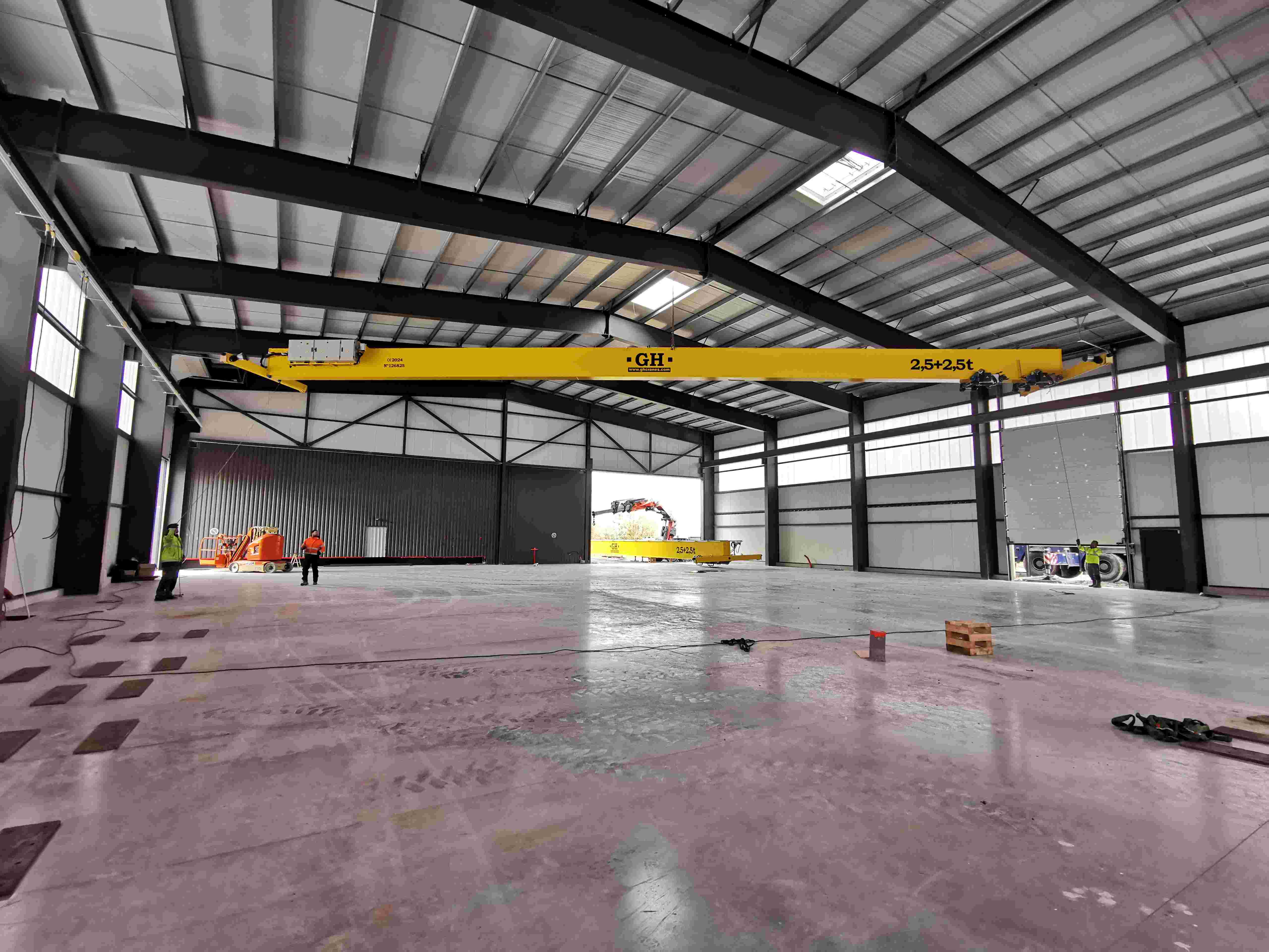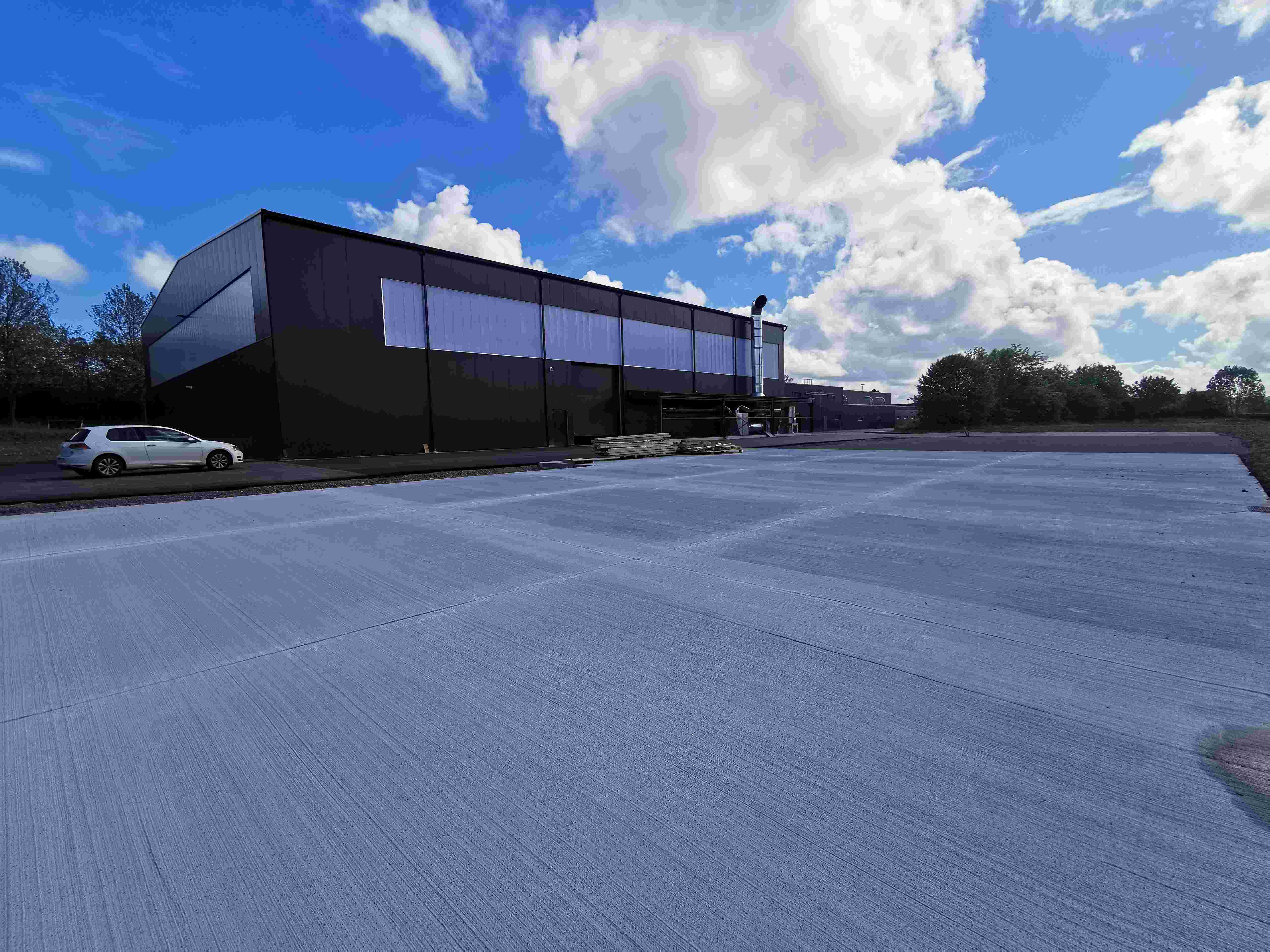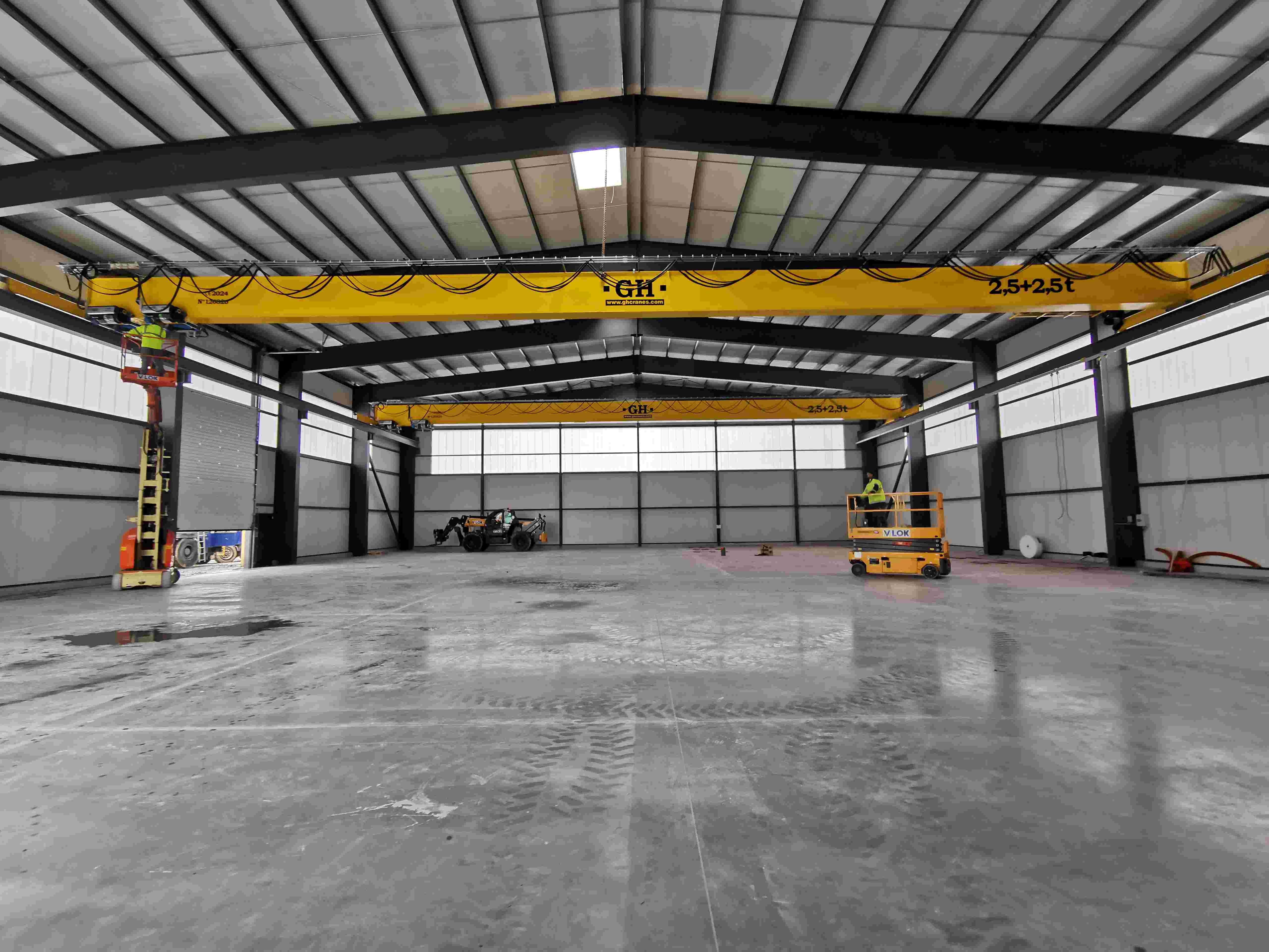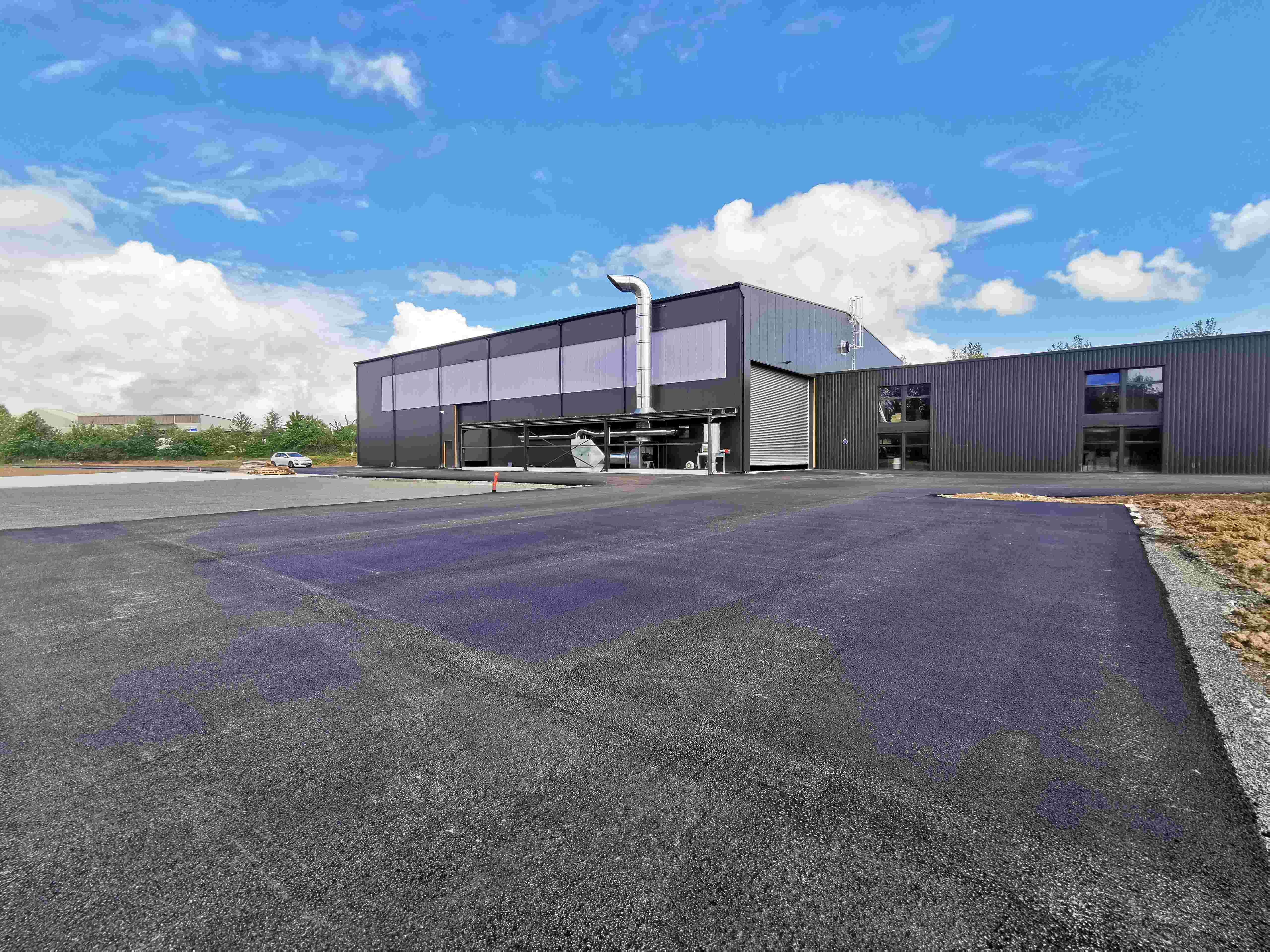 Charpente métallique avec panneaux sandwichs en couverture et bardage, bandeau lumineux, habillage en tôle acier laqué