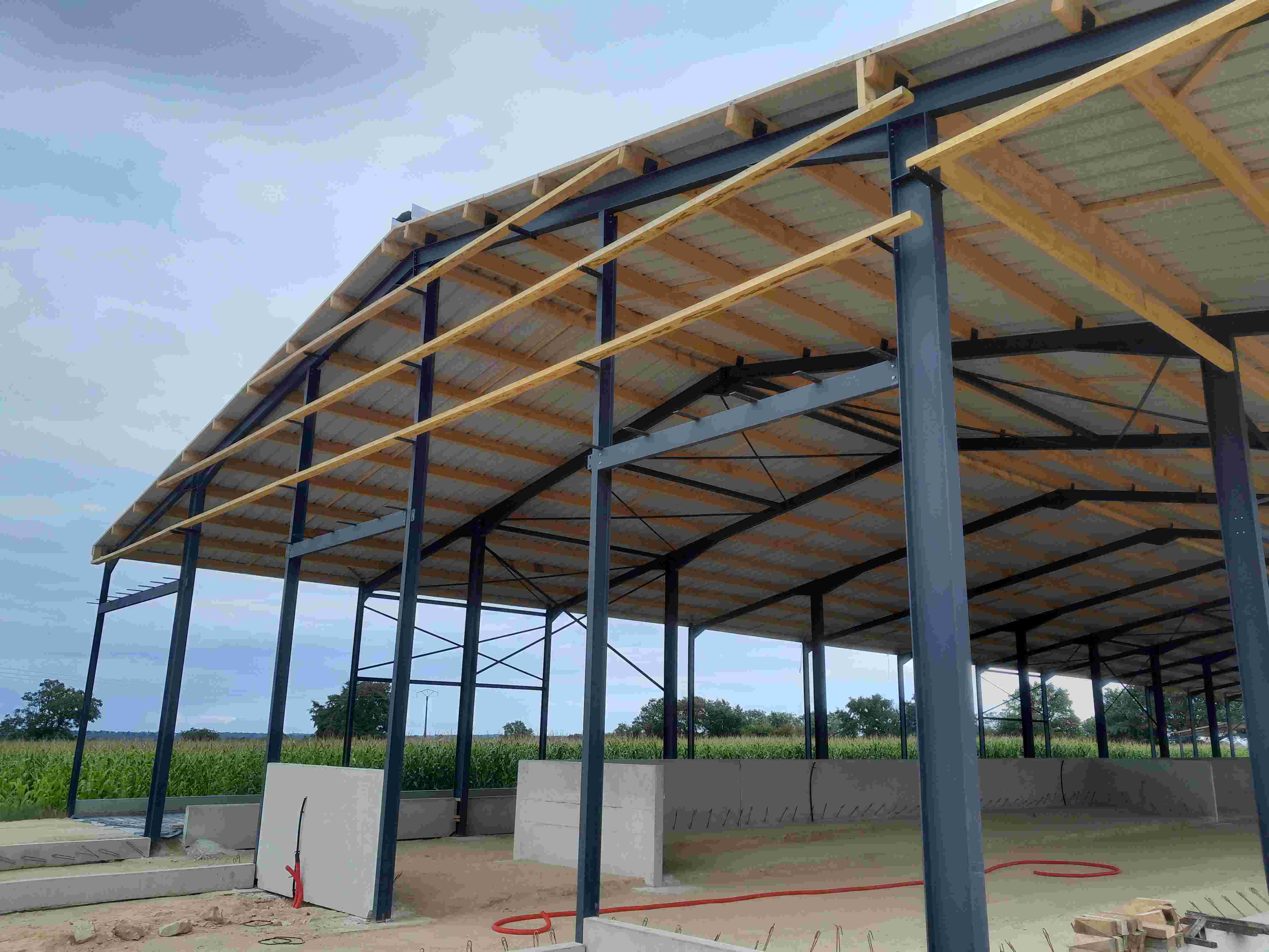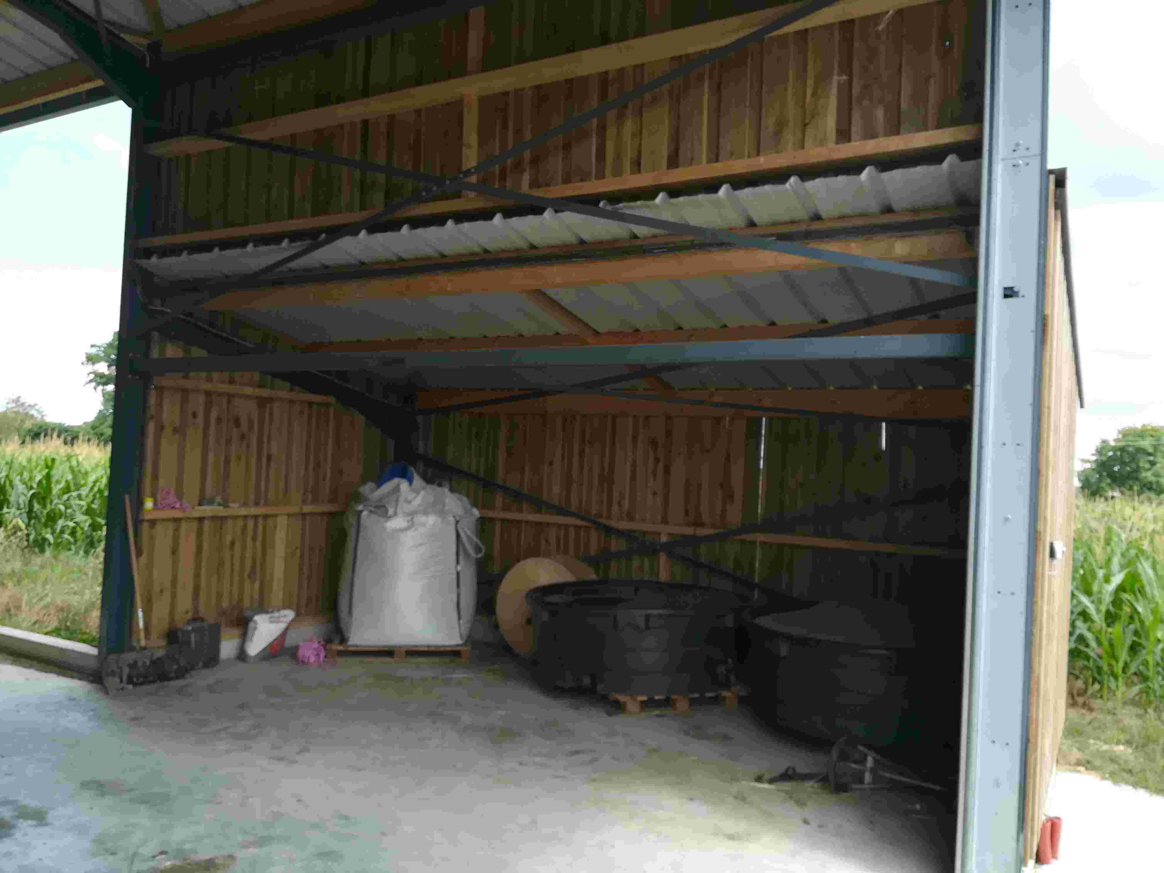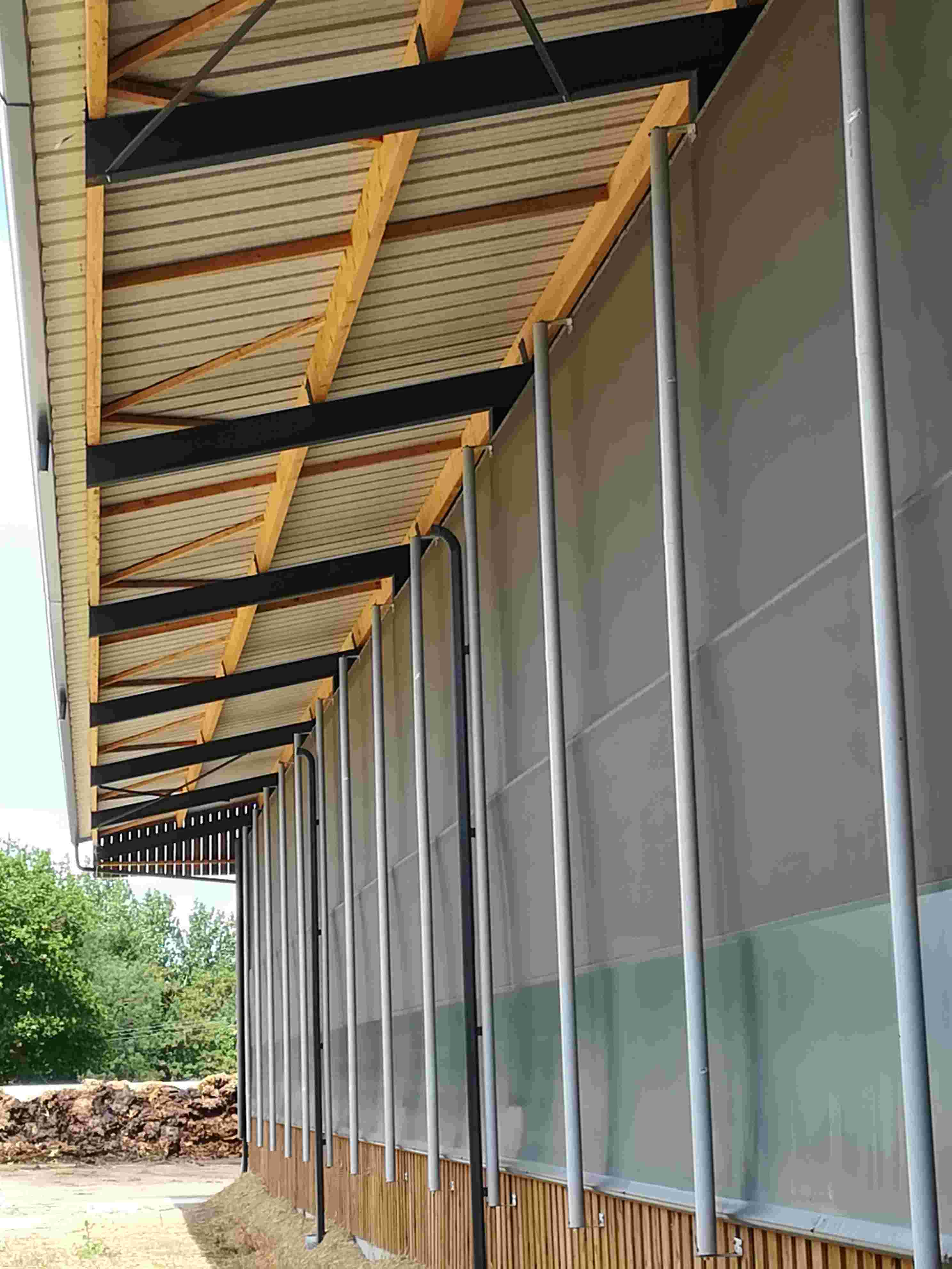 Stabulation : Couverture tôle, bardage en planches traitées à coeur, portails en tôle